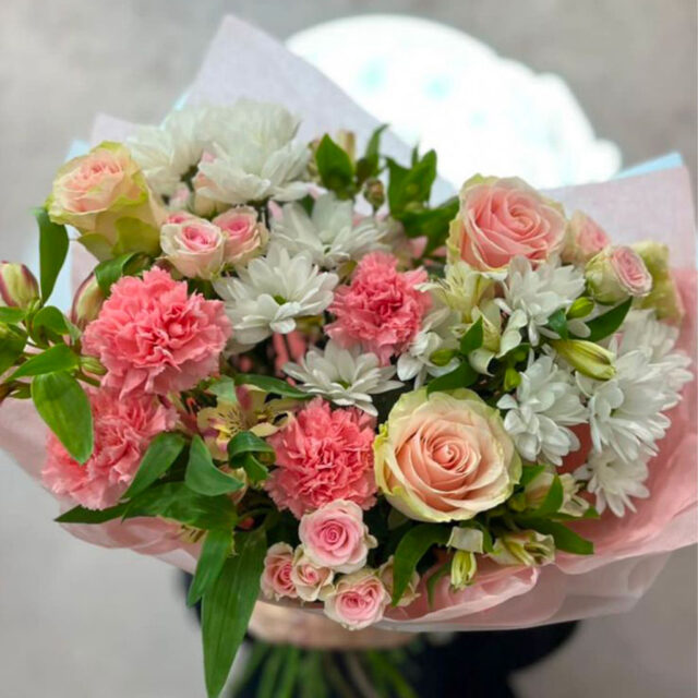 На фото представлен возможный вариант сборки. Мы соберем букет максимально похожий с использованием сезонных цветов и сохранением стиля композиции. Букет получится уникальным и неповторимым, как и его получатель.