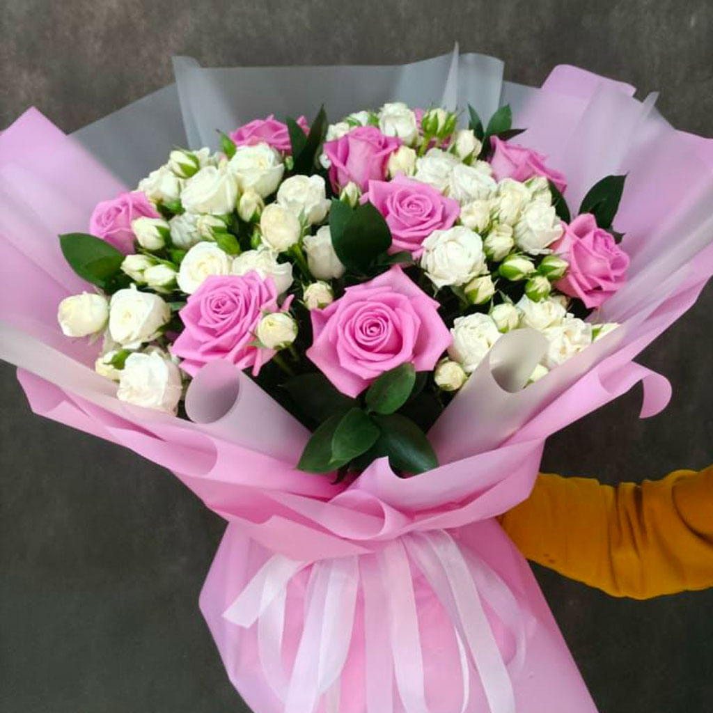 На фото представлен возможный вариант сборки. Мы соберем букет максимально похожий с использованием сезонных цветов и сохранением стиля композиции. Букет получится уникальным и неповторимым, как и его получатель.