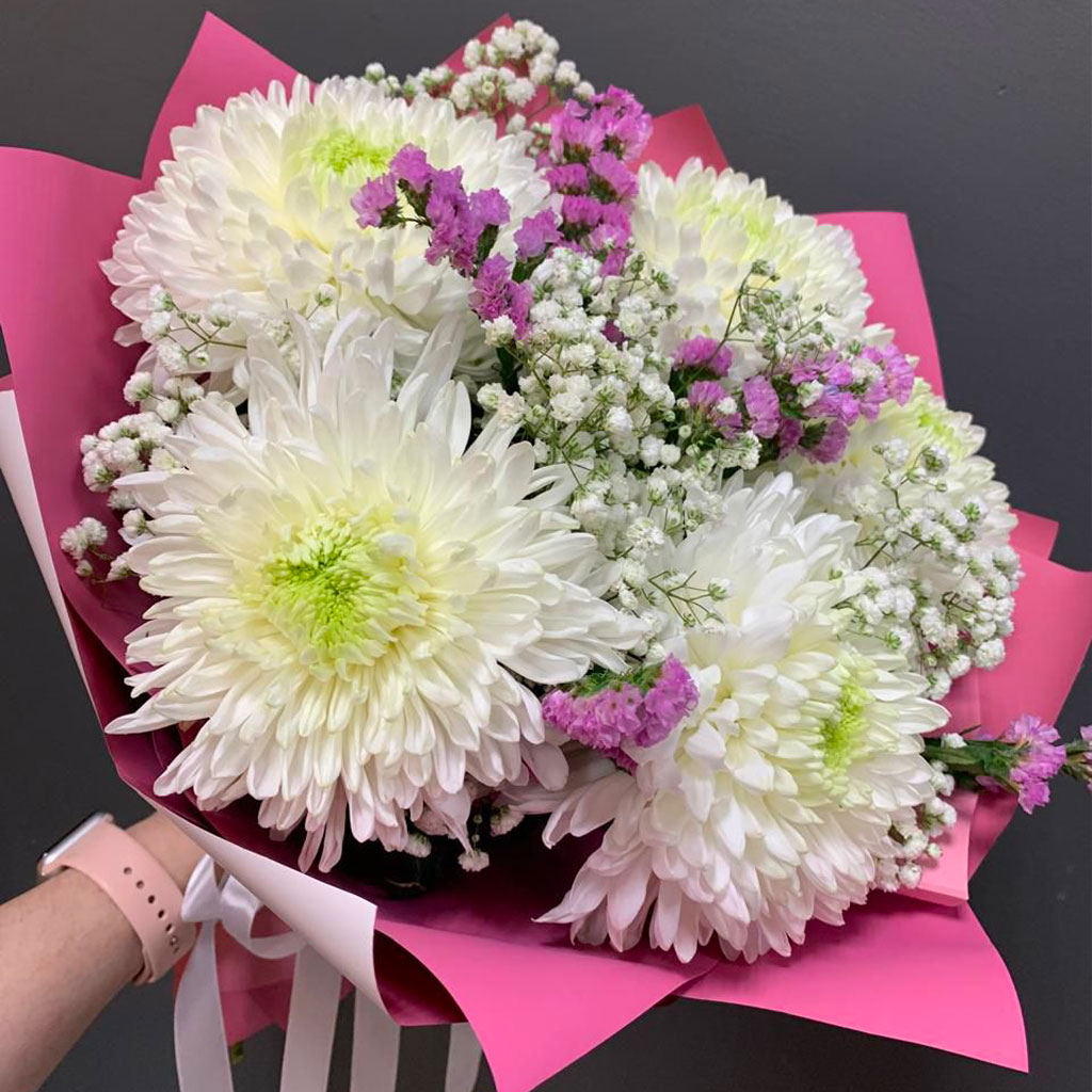На фото представлен возможный вариант сборки. Мы соберем букет максимально похожий с использованием сезонных цветов и сохранением стиля композиции. Букет получится уникальным и неповторимым, как и его получатель.