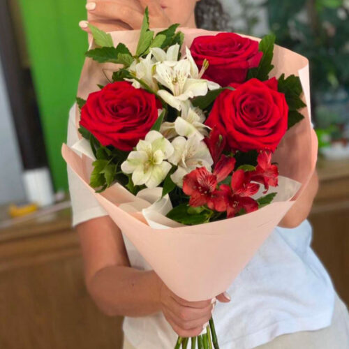 На фото представлен возможный вариант сборки. Мы соберем букет максимально похожий с использованием сезонных цветов и сохранением стиля композиции. Букет получится уникальным и неповторимым, как и его получатель.